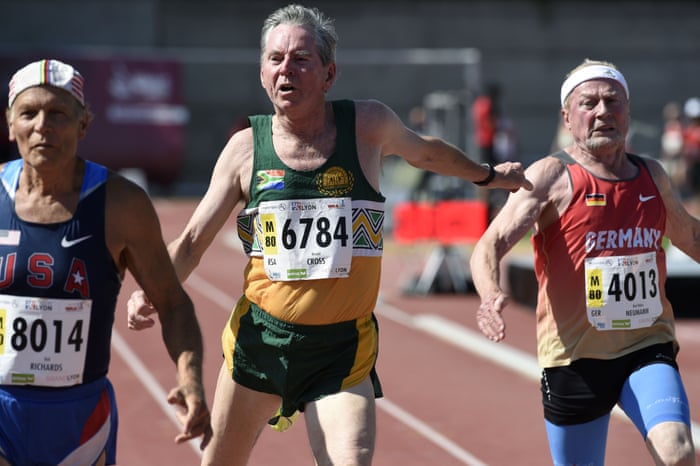 V prí pade dlhších vzdialeností aj športovci ukazujú vek nie je prekážkou pôsobivých časov , V roku 2004, kanadská Ed Whitlock, 73, rozbil trojhodinovú značku pre maratón - úspech mnoho oveľa mladší klub športovci dokázali zabiť. Trénoval spustením okolo miestneho cintorína za dve alebo tri hodiny takmer každý deň. Ďalšie Canadian, Olga Kotelko, ktorý zomrel minulý rok na 96, ktoré sa konalo viac ako 30 svetových rekordov pre vekovú kategóriu 90-95.Facebook Twitter Pinterest Zľava: US športovec Irene Obera, Taliansku Emma Maria Mazzenga a austrálska Constance Marmour spustiť počas ženskej 80-ročného 100m finále. Foto: Philippe Desmazes / AFP / Getty Images